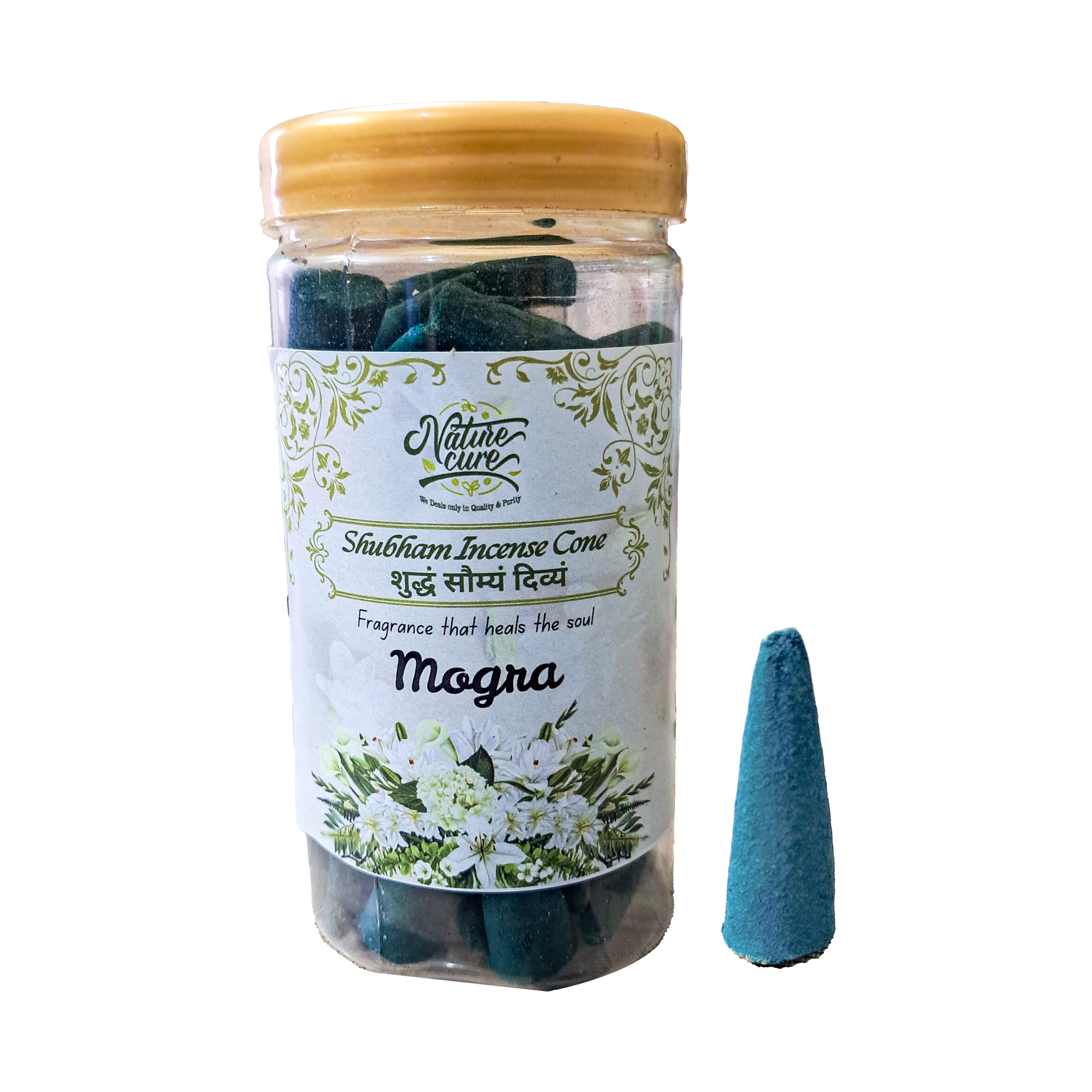 Naturecure Shubham Mogra Dhoop Cones 100g – Sweet floral incense cones made with natural ingredients. Ideal for pooja, meditation, yoga & home fragrance. Eco-friendly cones packed in a resealable PET jar with free stand. Buy online with free delivery across India.